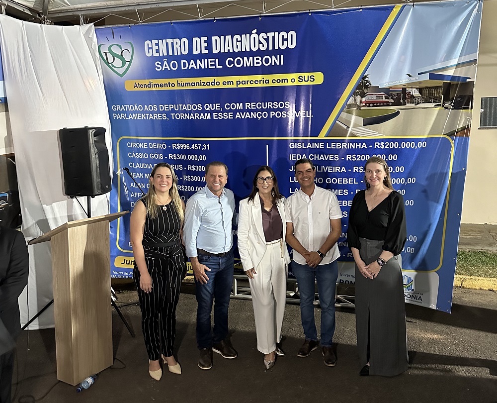 CENTRO DE DIAGNÓSTICO SÃO DANIEL COMBONI No último dia dez, foi realizada prestigiada cerimônia de LANÇAMENTO DA PEDRA FUNDAMENTAL DO CENTRO DE DIAGNÓSTICO SÃO DANIEL COMBONI da ASSDACO – Associação Assistencial à Saúde São Daniel Comboni instituição sem finalidade lucrativa, com 21 ANOS de trabalho em Cacoal e toda Região Macro II da Saúde em Rondônia, com o objetivo de elevar o nível de vida da comunidade. Atualmente com um grande complexo hospitalar, que agrega a CAPELA sob a responsabilidade da Paróquia Sagrada Família, a CASA DE APOIO AMOR FRATERNO sob a responsabilidade da Maçonaria, o CENTRO DE CATETERISMO sob a responsabilidade do médico cardiologista Alex Sandro dos Santos Carvalho, o HEURO sob a responsabilidade do Governo do Estado de Rondônia, o CENTRO DE DIÁLISE sob a responsabilidade da Prefeitura de Cacoal e o CENTRO DE ONCOLOGIA SÃO DANIEL COMBONI sob a responsabilidade da ASSDACO em parceria com o médico OLAMIR ROSSINI JÚNIOR. Na foto quatro dos 20 deputados estaduais CLAÚDIA DE ABREU, CIRONE DEIRÓ, a presidente VERA BIANCHINI da ASSDACO, CÁSSIO GOIS e GISLAINE LEBRINHA, que por meio de emendas parlamentares destinaram R$ 4.996.457,31 para a construção do CENTRO DE DIAGNÓSTICO SÃO DANIEL COMBONI.
