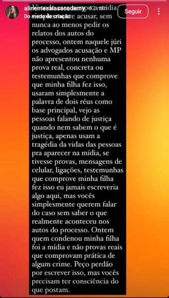 O caso continua a repercutir na cidade e nas redes sociais, agora com mais um capítulo marcado pelo desabafo da mãe da condenada, que questiona o papel da mídia e da sociedade no desfecho do processo judicial.