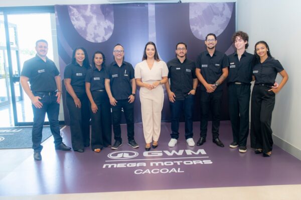 EQUIPE GWM MEGA MOTORS – CACOAL A empresária Poliana Miranda entre a dinâmica equipe de sua moderna concessionária GWM MEGA MOTORS em Cacoal/RO. Na foto Embaixador de Vendas André Dotto Pacheco, Gestora de Qualidade Eliana Aranha, Embaixadora de Vendas Valeria Pereira, Gestor Administrativo Lindomar Andrade, Consultor de Serviços Willens Salcedo, Embaixador de Vendas Williann Vidal, Assistente de Marketing Eduardo Olinto e Recepcionista Ellen Franklin
