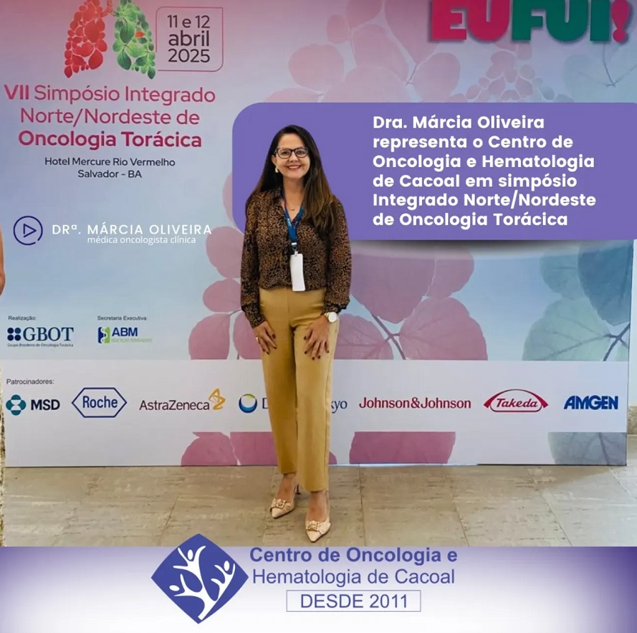 MARCIA OLIVEIRA NO SIMPÓSIO DE ONCOLOGIA Dedicada à profissão, a Médica Oncologista Clínica MARCIA OLIVEIRA representou o CENTRO DE ONCOLOGIA E HEMATOLOGIA DE CACOAL no VII SIMPÓSIO INTEGRADO NORTE/NORDESTE DE ONCOLOGIA TORÁCICA no Hotel Mercure Rio Vermelho em Salvador/BA, no período último de 11 e 12 de abril