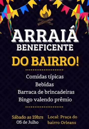 O evento será realizado na praça do próprio bairro e promete uma noite de muita alegria, comidas típicas, música, brincadeiras, pula-pula e diversas atrações voltadas ao público de todas as idades.