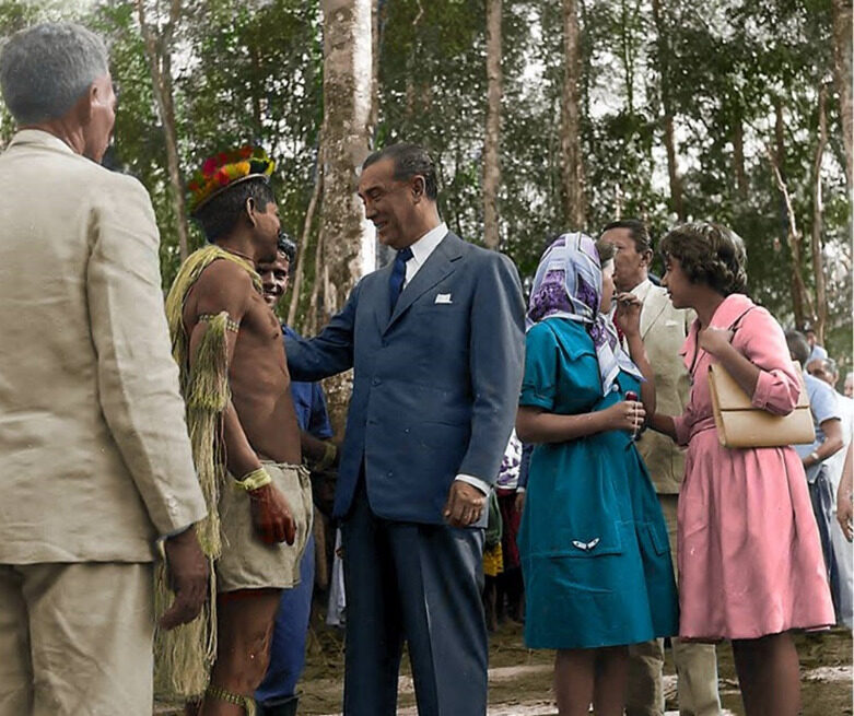Entre afetos e sorrisos – Em seu diário, o presidente registrou sua admiração pelos artefatos dos nativos de Vilhena. Enquanto ele se encantava com o contato e era chamado de “grande pai” pelos indígenas, sua esposa e filha (logo atrás na imagem) permaneciam alheias à cena. Foto: Acervo de Anderson Leno / Colorização: Luís Claro … – Veja mais em https://portalamazonia.com/jotao-escreve/rodovia-rondonia-brasil-jk/