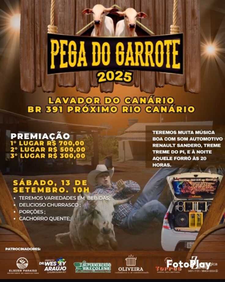 No próximo sábado, 13 de setembro, a partir das 10h, será realizada a “Pega do Garrote 2025”, no Lavador do Canário, localizado na BR-391, próximo ao Rio Canário, em Chupinguaia.