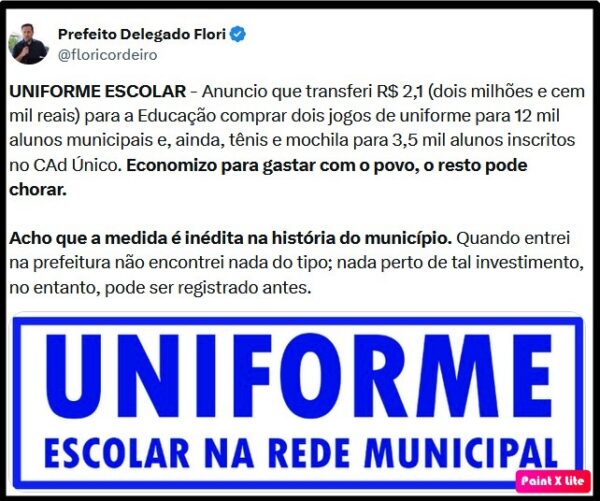 O prefeito de Vilhena, Delegado Flori (PODE), anunciou neste sábado, 27, por meio de suas redes sociais, um novo investimento de R$ 2,1 milhões para a compra de uniformes escolares destinados a todos os estudantes da rede municipal.