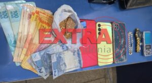 No imóvel, os policiais localizaram uma pedra de crack sobre a mesa da área e uma porção de maconha sobre a escrivaninha do quarto, além de R$ 765,00 em dinheiro, possivelmente provenientes da venda de entorpecentes.