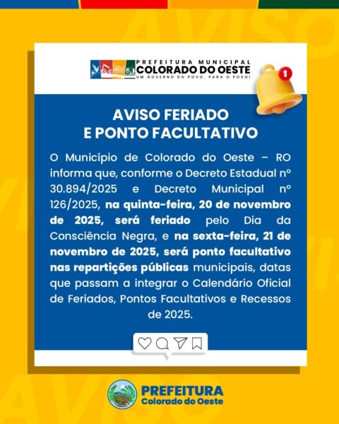 A Prefeitura de Colorado do Oeste publicou, nesta terça-feira (18), o decreto que estabelece ponto facultativo nas repartições públicas municipais na sexta-feira, 21 de novembro de 2025.