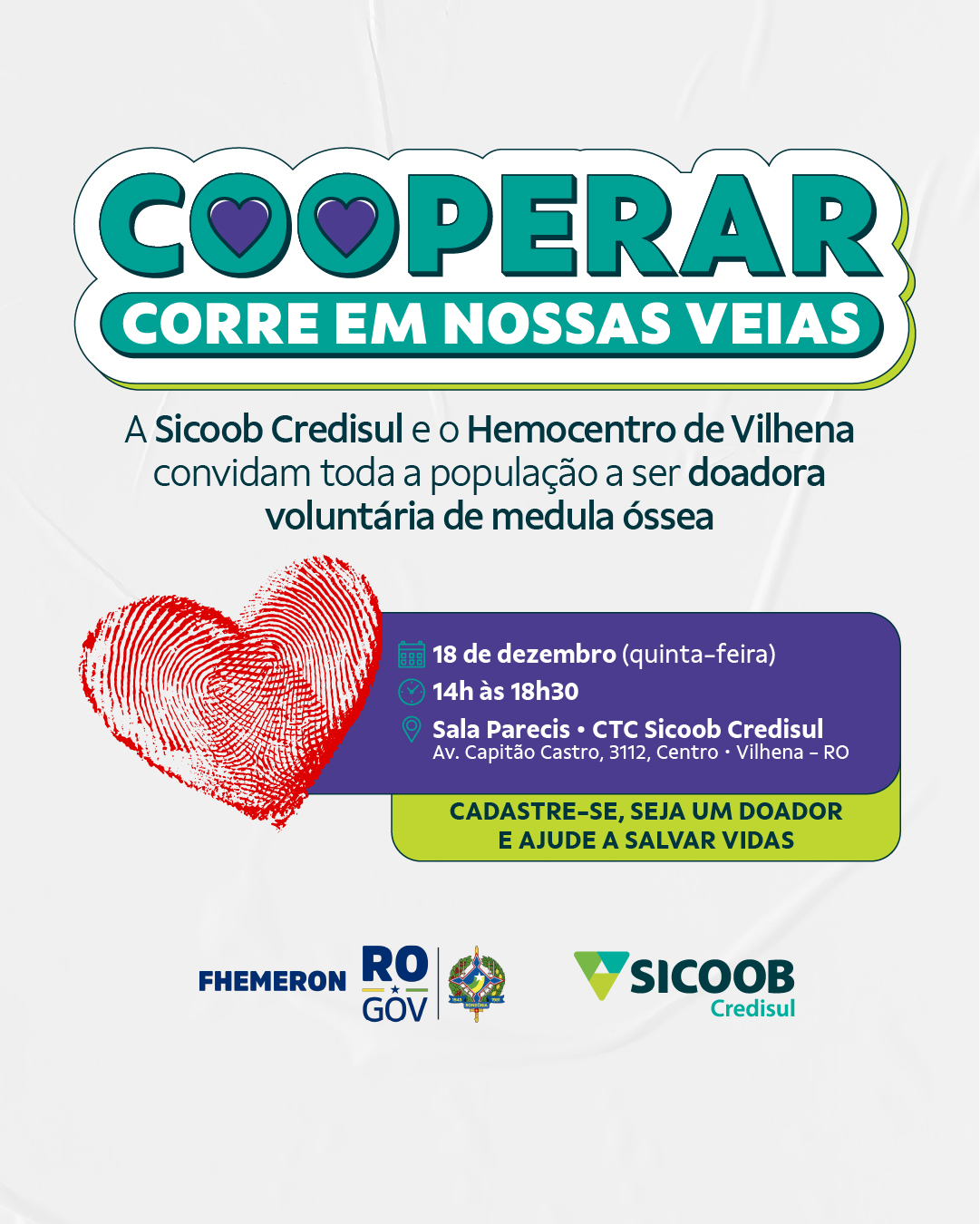 A Sicoob Credisul, em parceria com o Hemocentro de Vilhena, promove nesta quinta-feira,18 de dezembro, mais uma ação da campanha “Cooperar Corre em Nossas Veias”, com o objetivo de incentivar o cadastro de doadores voluntários de medula óssea no município.