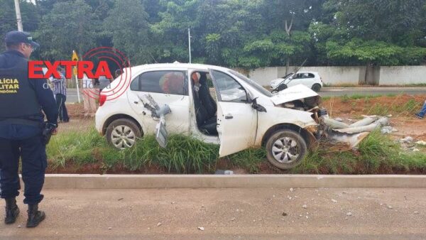 Durante a manobra, o condutor do Gol perdeu o controle da direção e colidiu contra um poste de iluminação pública às margens da rodovia. O impacto foi intenso e o poste quebrou em vários pontos, chegando a atravessar o veículo e sair pela porta traseira direita.
