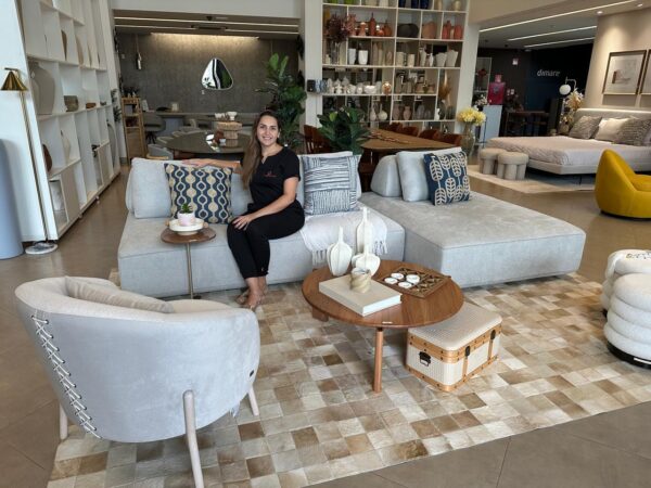 Com 26 ANOS em Cacoal, a CASA E DECORAÇÃO loja de móveis e decoração, a mais completa no estado de Rondônia, está localizada em prédio próprio e moderno. Com amplo espaço em sua estrutura, o prédio possui três pavimentos, com inúmeros showrooms, e departamentos como o de cortinas sob medida, o que possibilita uma maior exposição de seus produtos. Na foto a consultora de vendas Syndell Foli em um dos diversos showrooms