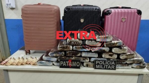 Uma mulher foi presa na noite de sexta-feira, 20 de fevereiro de 2026, ao ser flagrada transportando quase 29 quilos de maconha em um ônibus interestadual no terminal rodoviário de Vilhena.