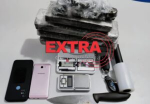 No local, foram apreendidas porções de maconha, cocaína, haxixe e comprimidos de ecstasy, além de balança de precisão, embalagens tipo ziplock e aparelhos celulares.