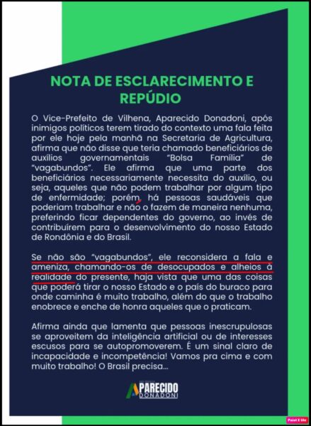 Em nota, o vice-prefeito tenta esclarecer o fato e, ao mesmo tempo, admite a declaração, afirmando que “se não são vagabundos, ele reconsidera a fala e ameniza, chamando-os de desocupados e alheios à realidade do presente” (leia no final da matéria).