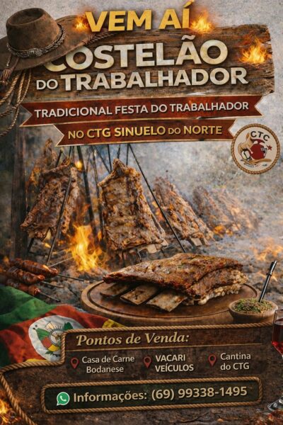 O Centro de Tradições Gaúchas (CTG) Sinuelo do Norte promoverá, no dia 1º de maio de 2026, a tradicional festa Costelão do Trabalhador, em comemoração ao Dia do Trabalhador.