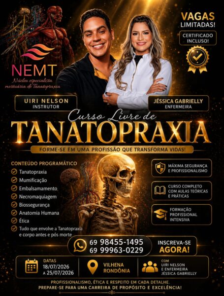 Vilhena se prepara para sediar uma oportunidade rara de especialização no setor funerário. Estão abertas as inscrições para o Curso de Tanatopraxia, que será realizado entre os dias 18 e 25 de julho.