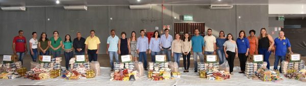 No centro da foto, de camisas azul claras, o vice-tesoureiro Jonas Góis e a esposa Simone Sodré Góis e o presidente Jorge Alves da Arca, com a esposa Elizete Marquiori Alves, entre os representantes das instituições beneficiadas com as doações, Família Ágape, Absai, Lar do Idoso, Casa de Acolhida Nova Esperança, Casa de Acolhida Amor Fraterno, Cernic, Creche Leãozinho, Creche Teca, Casa de Acolhida São Camilo e Amigas do Pão.