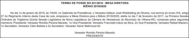 Perguntar não ofende: tendo como base o princípio jurídico/administrativo da transparência, porque os vereadores decidiram fazer a posse da nova Mesa Diretora sem comunicar à imprensa? O termo de posse 021/2018 (VEJA ABAIXO) informa que o ato oficial aconteceu às 10h de terça-feira, 1, no gabinete da presidência da Câmara. O evento é legal, mas dá a impressão de que queriam esconder alguma coisa. Com a palavra, o novo presidente da Casa, Ronildo Macedo!