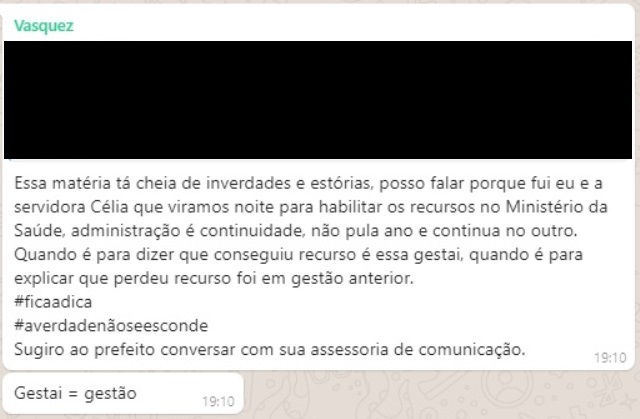 “Essa matéria tá cheia de inverdades e estórias. Posso falar porque fui eu e a servidora Célia que viramos noite para habilitar os recursos no Ministério da Saúde. Administração é continuidade, não pula ano e continua no outro. Quando é para dizer que conseguiu recurso é essa gestão, quando é para explicar que perdeu recurso foi em gestão anterior.#ficaadica #averdadenãoseesconde. Sugiro ao prefeito conversar com sua assessoria de comunicação”, desabafou.