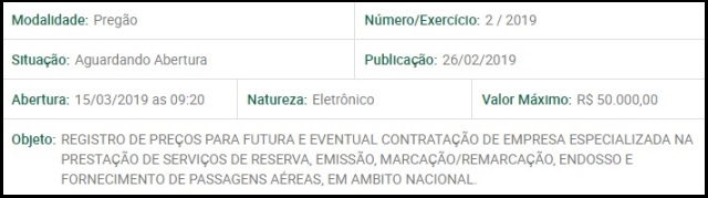 Nesta terça-feira, 25, o Diário Oficial do Município publicou o anúncio do pregão eletrônico nº 002/2019/CVMV que tem por finalidade o registro de preço para futura e eventual contratação de empresa para o fornecimento de passagens aéreas nacionais à Câmara de Vilhena.