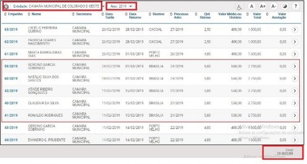 Conforme o site do Portal da Transparência, em Colorado do Oeste foram exatos R$ 29.900.00. As diárias incluem viagens a Porto Velho e Brasília. Cinco parlamentares – incluindo o presidente da Casa, Gercino Garcia – pegaram cinco diárias cada para ir até à capital federal no valor individual de R$ 2.750,00 (IMAGEM ABAIXO). Eles usaram o veículo oficial para se deslocar de Colorado até o aeroporto de Cuiabá (MT), onde embarcaram em voo à Brasília.