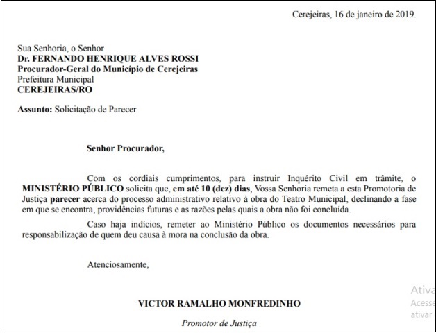À Secretaria Municipal de Educação, Zenilda Mendes da Silva, solicitou cópia do processo administrativo, bem como indicação da autoridade a quem compete a supervisão da obra do Teatro Municipal. “Deverá descrever a atual fase da obra, providências remanescentes e a razão da sua não conclusão”, completou o promotor.