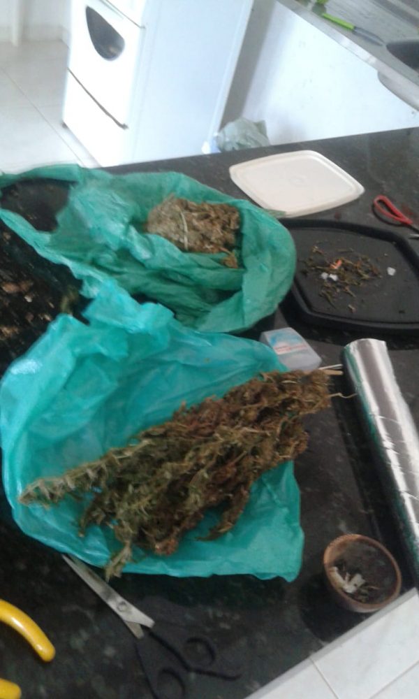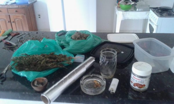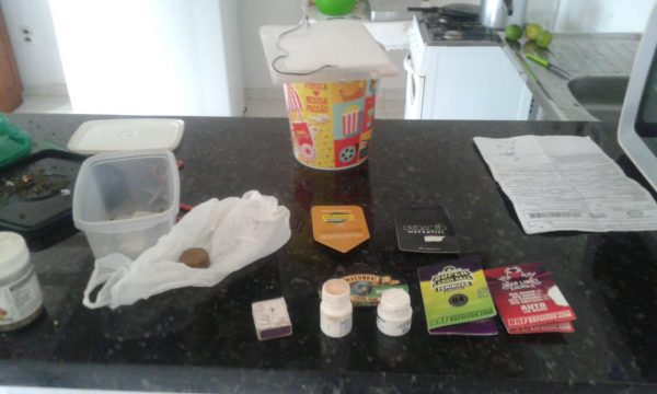 Já no interior do imóvel foram localizados em cima de um balcão, seis invólucros de maconha pesando cerca de 248 gramas, quatro tesouras, uma faca, papel alumínio, uma balança de precisão e três frascos plásticos contendo sementes da droga para o cultivo.