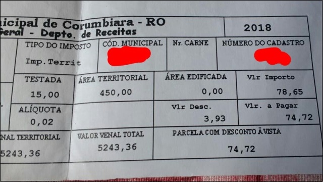 Os moradores do município de Corumbiara, na região sul de Rondônia, estão abismados com o valor do aumento do Imposto Predial Territorial Urbano (IPTU) de 2019.