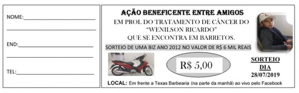 Para ajudá-lo basta adquirir uma rifa no valor de R$ 5,00, onde será sorteado uma moto Honda Biz 2012 no valor de R$ 6 mil. O resultado será divulgado no dia 28 julho, em frente a Texas Barbearia no centro de Colorado.