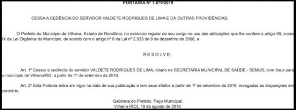 O aviso da suspensão da cedência foi publicada no Diário Oficial Eletrônico de Vilhena desta terça-feira, 20 de agosto, através da portaria nº 1.679/2019. Contudo, o mandatário municipal foi gentil com a servidora, e resolveu cessar a cedência a partir de 1º de setembro de 2019.