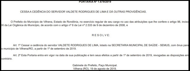 O caso foi amplamente divulgado pelo Extra de Rondônia devido a uma curiosidade: Valdete recebe salário desde janeiro da prefeitura de Vilhena (leia AQUI), sem ainda ter sua cedência referendada pela Câmara de Vereadores, conforme determina a Lei nº 2.533/08, alterada pela Lei nº 4.761/17.
