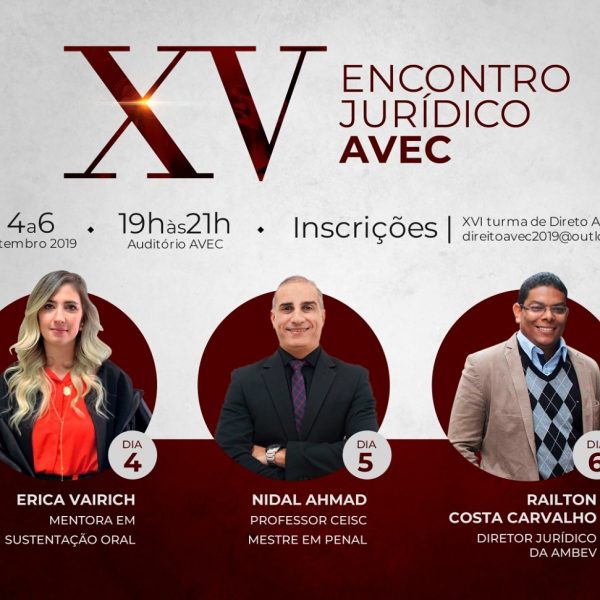 A Faculdade AVEC em conjunto com a XVI turma de direito realizam em setembro, entre os dias 04 e 06, o “XV Encontro Jurídico” que desta vez trará três palestrantes de renome nacional, são eles Erica Vairich, Nidal Ahmad e Railton Costa Carvalho.
