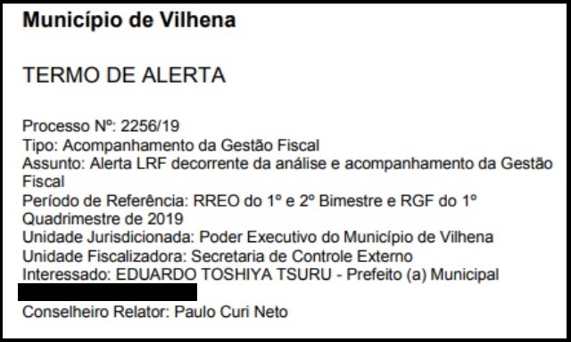 O Tribunal de Contas do Estado de Rondônia (TCE/RO) emitiu, na última semana, um “Termo de “Alerta” à prefeitura de Vilhena por ultrapassar a despesa total com pessoal.