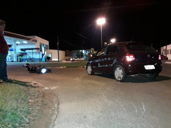 Acidente envolvendo uma moto e um carro aconteceu na noite desta quinta-feira, 14, no cruzamento da Avenida Tancredo Neves com a Avenida Presidente Nasser, no bairro Jardim América, em Vilhena.