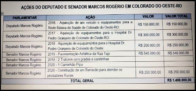 Os alocação de recursos iniciam ainda em 2016, quando Marcos Rogério era deputado federal. Nesta condição, destinou os seguintes benefícios: