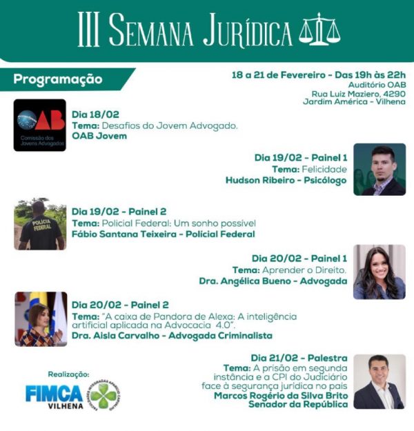 De 18 a 21 de fevereiro, a Faculdade Fimca estará realizando a sua “III Semana Jurídica” no auditório da OAB, localizado na Rua Luiz Maziero, 4290 – Jardim América em Vilhena.