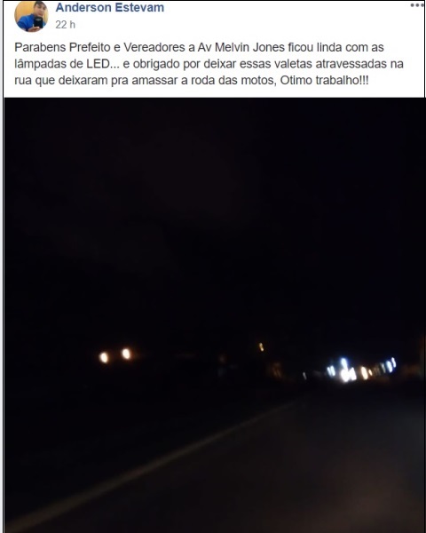 “Parabéns Prefeito e Vereadores. A Av Melvin Jones ficou linda com as lâmpadas de LED… e obrigado por deixar essas valetas atravessadas na rua que deixaram pra amassar a roda das motos. Ótimo trabalho!!!”, ironizou.