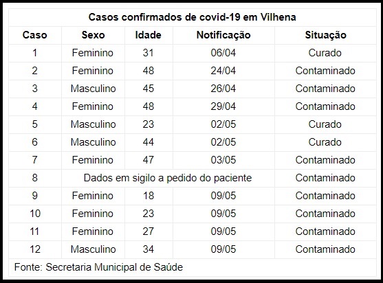 >>> Confira a tabela atualizada em anexo com os casos confirmados em Vilhena e sua respectiva situação