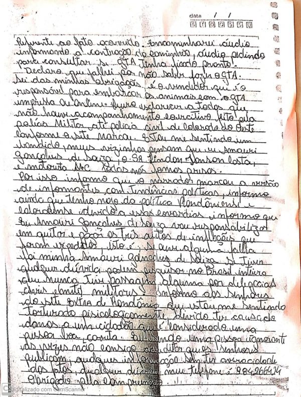 Em nota enviada ao Site, Amauri afirma ser morador da linha Zero Cinco, em Corumbiara, e que foi erro dele o não preenchimento da guia do GTA, sendo que tentou fazê-la online – imaginando que teria concretizado a ação, mandou embarcar e transportar 18 cabeças de gado vendidas para o servidor público lotado no Idaron de Colorado, Lindon Jonson Costa.