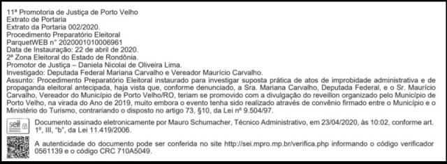 Na matéria, o MP descreve a instauração de procedimento eleitoral para investigar suposta prática de atos de improbidade administrativa e de propaganda eleitoral antecipada durante show na virada do ano de 2019 em Porto Velho, envolvendo Mariana e seu irmão, o vereador de Porto Velho, Maurício Carvalho (leia mais AQUI).