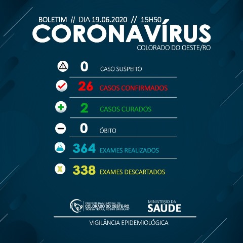 Boletim da Vigilância Epidemiológica divulgado na tarde desta sexta-feira, 19, confirma: Colorado do Oeste registrou 26 casos de covid-19.