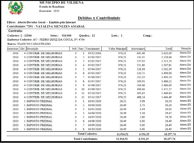 Conforme a Secretaria Municipal de Fazenda (Semfaz), o valor original era de R$ 11.714.00 e poderia ter sido parcelado em 36 vezes de R$ 259,56, mas, como a contribuinte não o fez, o relatório em anexo que mostra a origem do débito está organizado em parcelamento padrão de 12 meses.