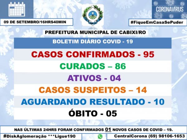 A Secretaria de Saúde de cidade de Cabixi, confirmou na tarde desta quarta-feira, 9, em seu boletim epidemiológico que o município contabiliza 95 casos de coronavírus e 5 mortes.