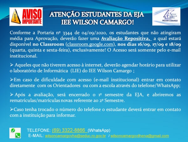 O Instituto Estadual de Educação Wilson Camargo de Vilhena informa aos alunos de Educação de Jovens e Adultos (EJA), que aqueles que não atingiram a média deverão realizar a prova repositiva disponível no Classroom entre os dias 16 e 18 de setembro.
