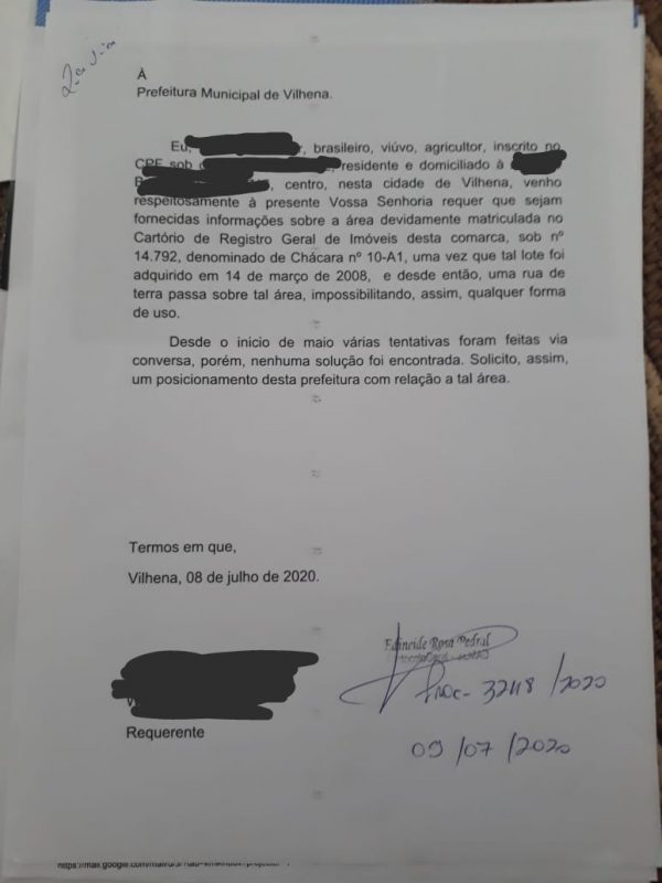 Tal medida teve de ser tomada devido ao fato do Município não tomar a providência solicitada em documento (em anexo) com relação a legalização da área que é de posse do proprietário desde 2008, não podendo, porém, se utilizar dela pois existe uma rua que cruza a propriedade.