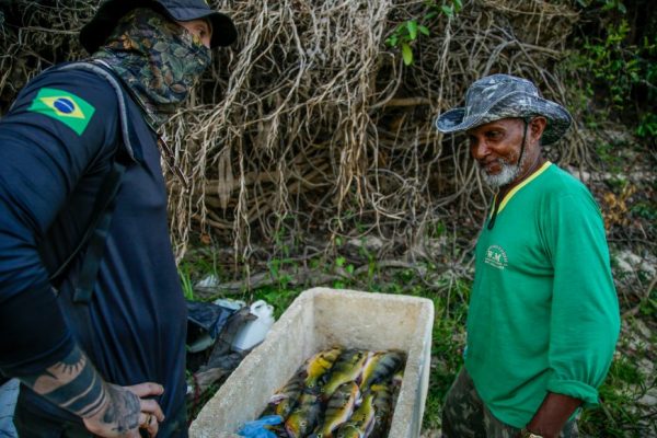 A lancha aborda o pescador Joaquim Vidal, que estocava tucunarés numa grande caixa de isopor. Ele viaja no pequeno barco acompanhado pela família, apresenta documentos e explica ser fornecedor para um restaurante na cidade há 15 anos.