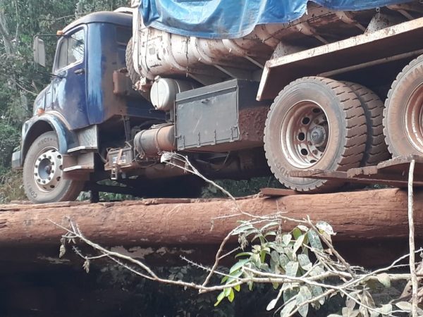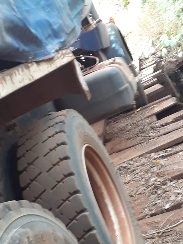 Mais de um mês após uma caçamba de calcário ter tombado na ponte do rio Taboca, Linha 105, divisa de Chupinguaia e Parecis, o local continua sem reparos.