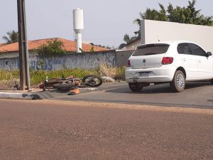Acidente entre moto e carro aconteceu na manhã desta sexta-feira, 6, na Rua Luiz Maziero, no bairro Jardim América, próximo a prefeitura de Vilhena.