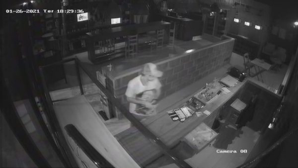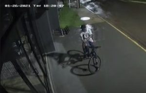 Imagem gravada pelo sistema de monitoramento da empresa mostra um homem trajando camiseta branca com estampa, calça jeans e boné escuro chegando numa bicicleta de cor preta, em seguida olha várias vezes para rua para não ser surpreendido em sua ação e após algumas tentativas arromba a porta, entra se debruça sobre o balcão e abre o caixa e furta.
