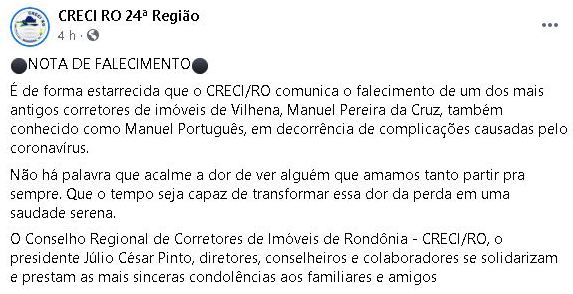 O Conselho Federal dos Corretores de Imóveis (CRECI) da 24ª Região emitiu nota de pesar em rede social pelo falecimento do corretor Manuel Português.