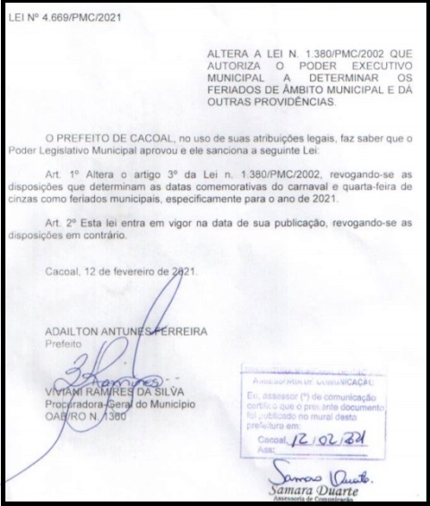 Por unanimidade, a Câmara aprovou o projeto de lei nº 4.669/2021 e revogou as disposições que determinam as datas comemorativas do Carnaval e Quarta-feira de Cinzas como feriados municipais para 2021 em Cacoal.