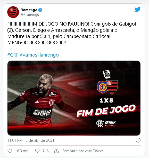 O Flamengo goleou o Madureira por 5 a 1, em jogo da 8ª rodada do Campeonato Carioca disputado no estádio Raulino de Oliveira na noite desta segunda-feira (5).